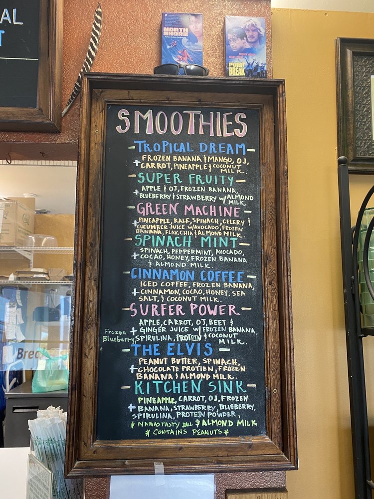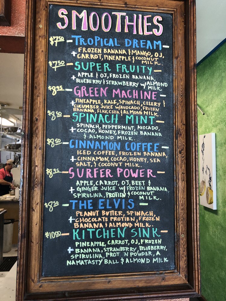 Cucumber, kale and celery juice with pineapple, banana, avocado with flax, chia and almond milk.