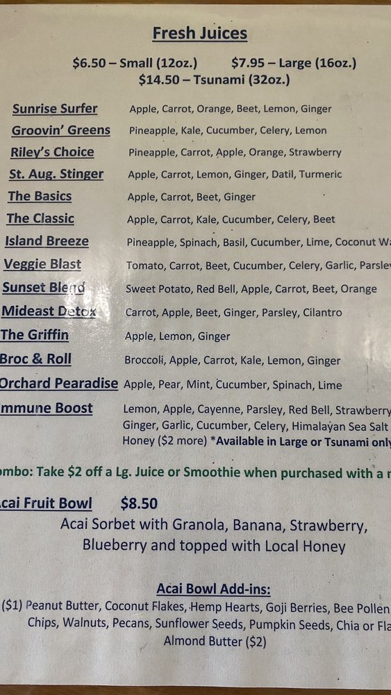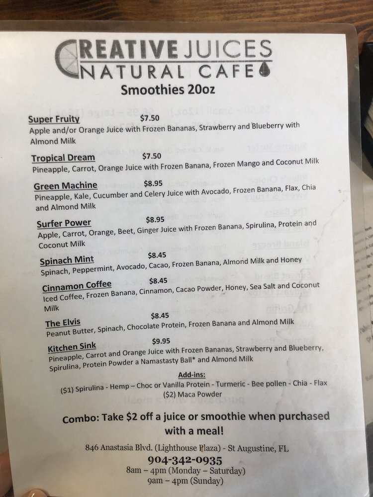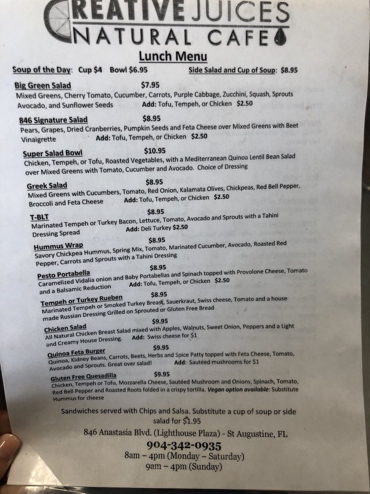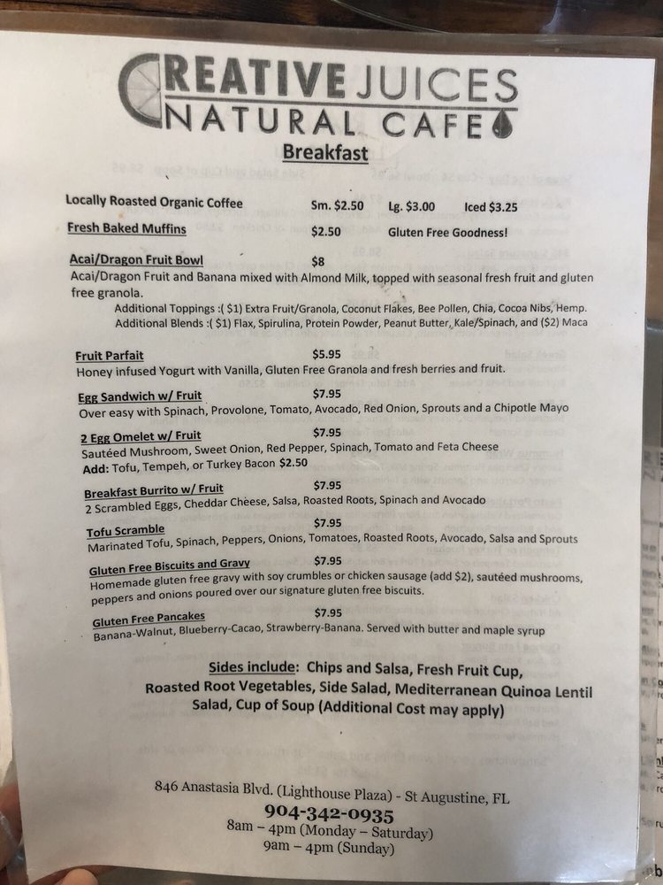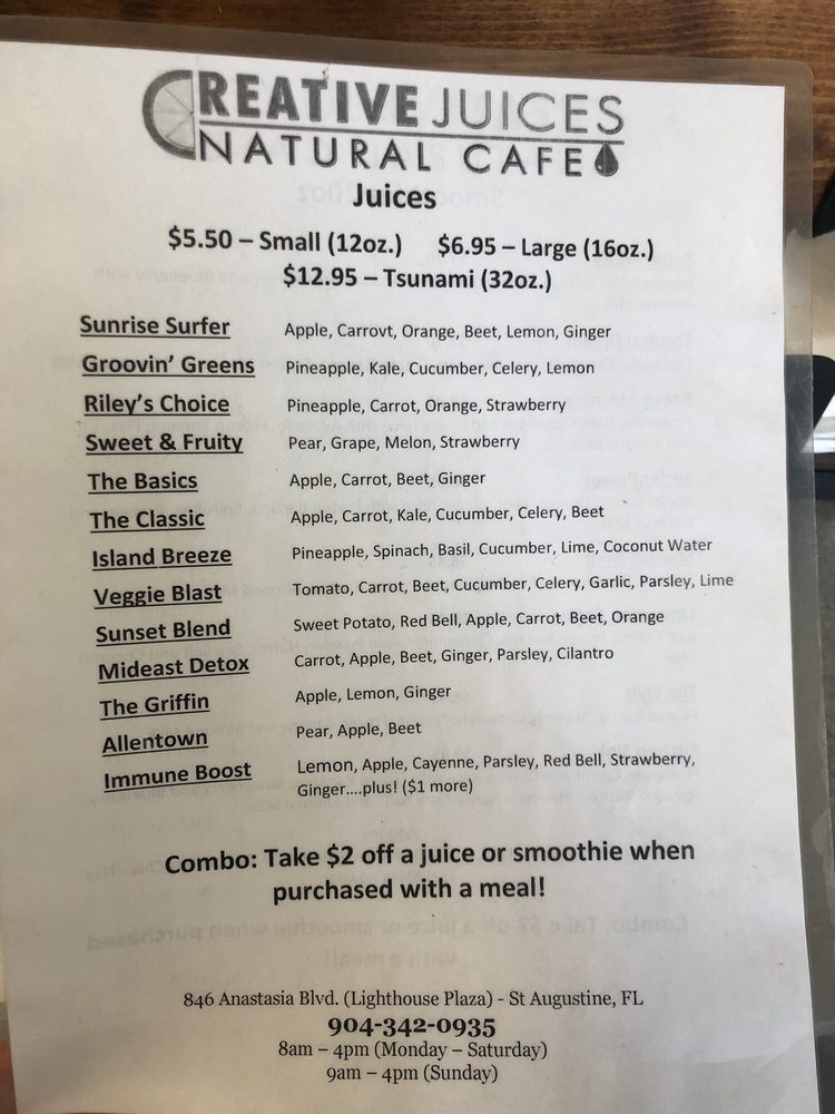Located in St. Augustine, FL, Creative Juices Natural Cafe offers a diverse menu of acai bowls, juice bar delights, and wholesome sandwiches. The cafe prides itself on catering to various dietary preferences, including vegan options and gluten-free selections. Customers rave about the fresh ingredients, flavorful dishes, and exceptional service. From the tempeh scramble to the T BLT with turkey bacon, each item is crafted with care and expertise. The menu also features fresh-squeezed juices, smoothies, and a selection of healthy breakfast options. The cozy yet vibrant atmosphere, paired with friendly staff, creates a welcoming dining experience. Whether you're looking for a nutritious meal or a refreshing juice combo, Creative Juices Natural Cafe is a must-visit for those seeking a delicious and health-conscious dining destination.